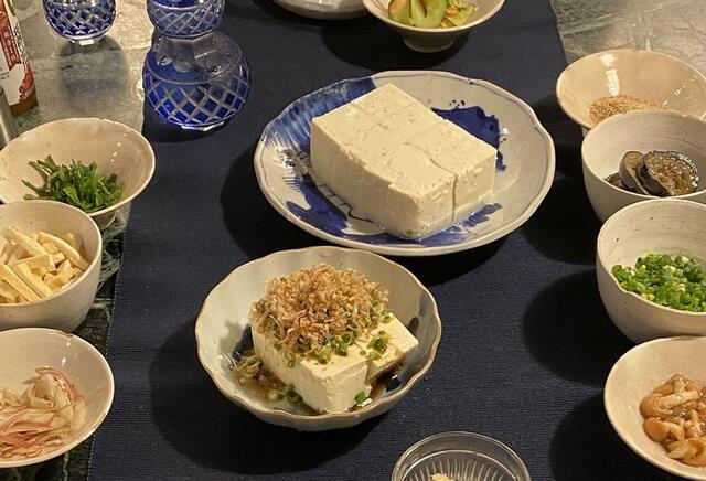 だだちゃ豆腐(olive oil,塩)&ふわっと絹豆腐(生姜、ねぎ、鰹節、醤油)。