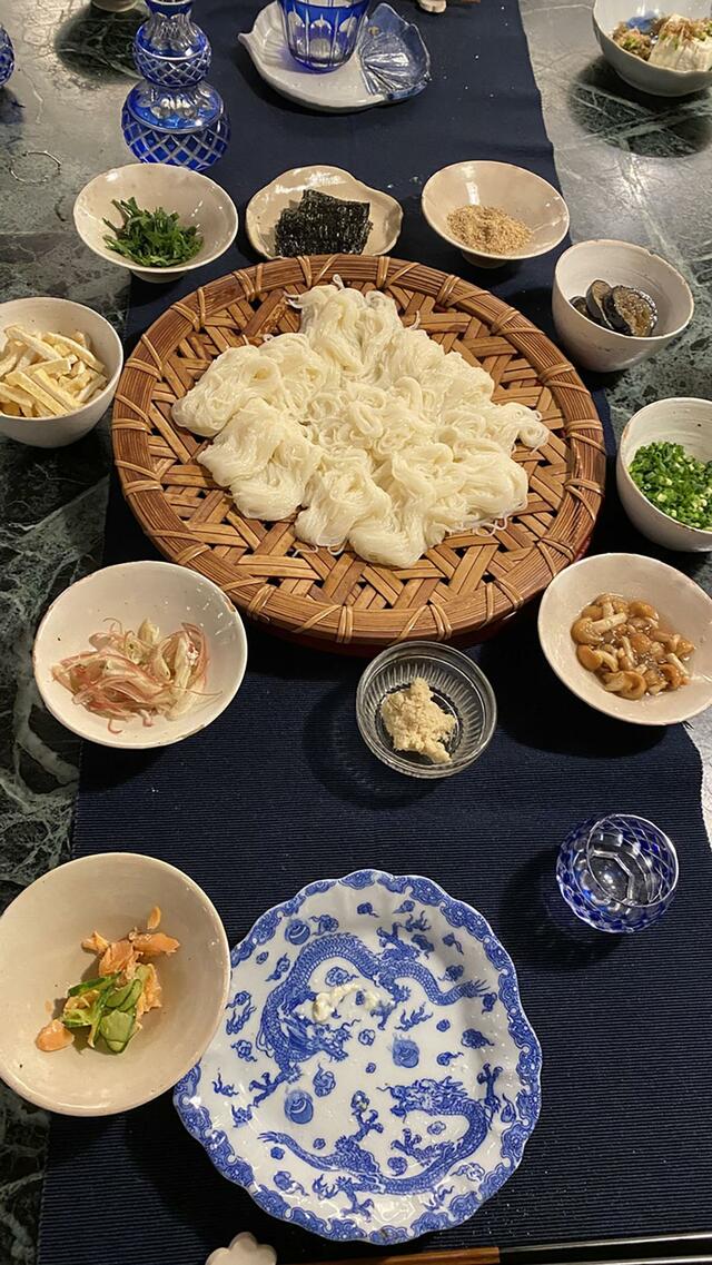 小豆島・甚助の素麺(薬味:油揚げ、シソ、焼き海苔、すりごま、ナス、ねぎ、なめこ、生姜、みょうが)。豆腐も素麺もいと旨し!!!