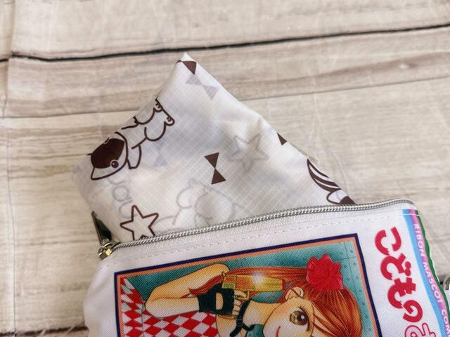ファスナーで開閉する仕様で、中にエコバッグが入っています。エコバッグのデザインはなんと紗南ちゃんのお母さんが飼っているリスのまろちゃんの総柄!