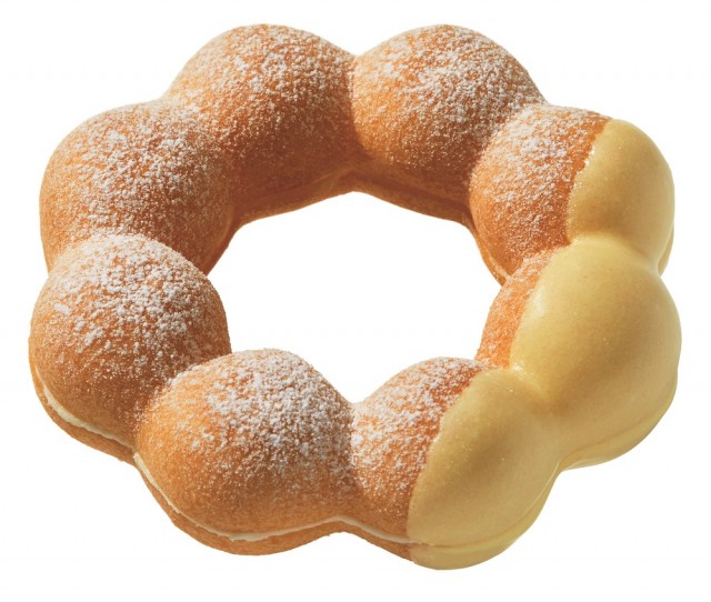 もちもち食感のポン・デ・リング生地を半分にカットし、レアチーズホイップをサンド。チーズ風味チョコをコーティングし、仕上げにシュガーがふりかけられています。