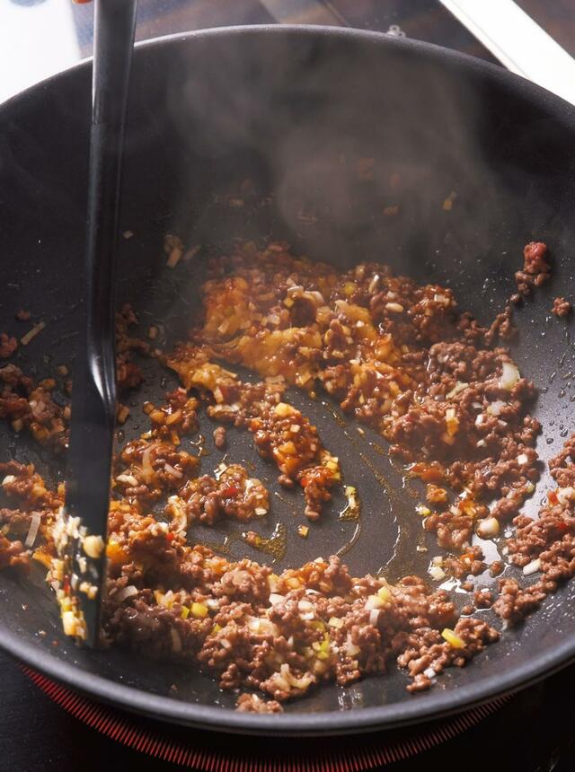 1. フライパンにサラダ油を弱めの中火で熱し、ひき肉をほぐしながら炒める。色が変わってきたら豆板醤を加えて炒める。