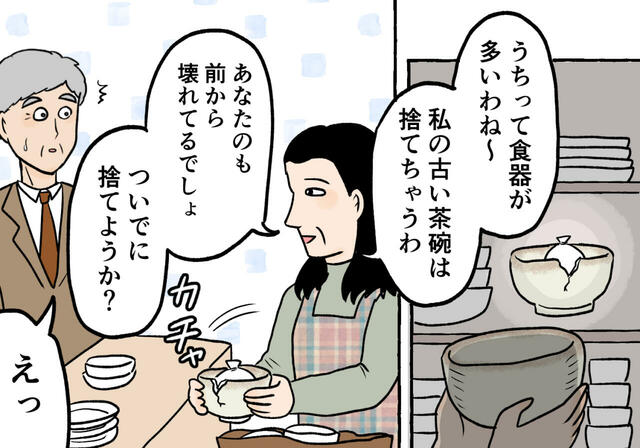 思い出の夫婦茶碗ですら処分しようとする姿に、直也は一抹の寂しさを感じるのでした。