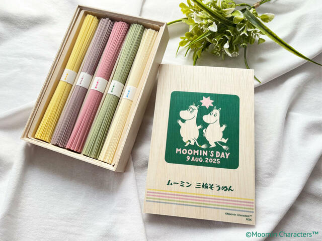 楽天市場店では「ムーミンの日」ロゴ入りの木箱に入った手延べ三輪そうめんを展開。黄色(かぼす)、紫(紫いも)、ピンク(梅)、緑(青しそ)、白(プレーン)の5色セットで、見た目にも華やかな仕上がりです!