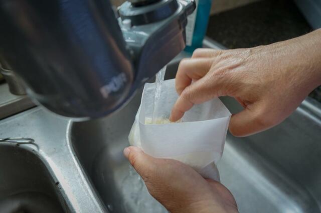 お米を袋にいれ、流水で米を洗います。洗い終わったら、上部の2重になっている部分をひっくり返して口を閉じれば準備完了。