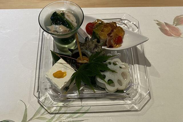 01:先付は5種の料理(おかわかめとハマグリ、夏野菜のジュレ、レンコンの梅肉サンド、稚鮎とサツマイモの入った焼き豆腐、姫サザエ。どの料理も繊細で旨味たっぷりで、美味しい〜〜! のっけからノックアウトされました)