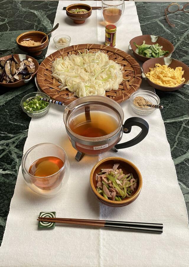 暑いですからねえ、2種類のおいしい素麺を頂いたものですからねえ、またもや素麺食べます。ナスの油炒め、揚げ玉、青梗菜、錦糸卵、すりごま、生姜、ネギ。これからの季節、素麺の出番が増えること必至。