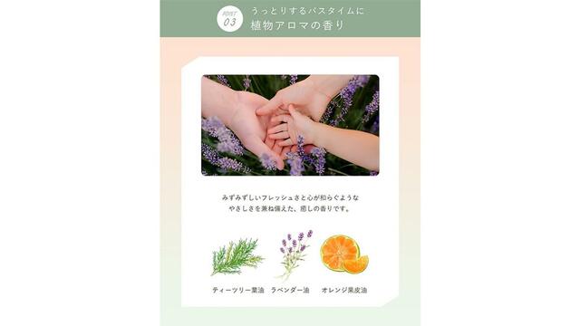 香りは植物アロマのティーツリー葉油、ラベンダー油、オレンジ果皮を合わせたもの。自然な匂いが好みな人にもオススメですよ。