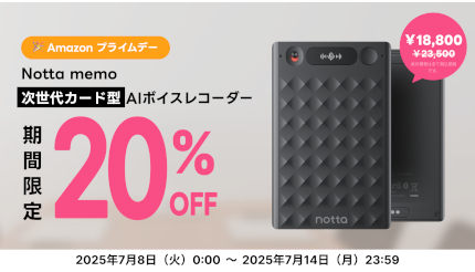 Nottaが販売する、サブスクリプション型AI議事録サービス「Notta」とシームレスに連携するAIボイスレコーダー「Notta Memo」がAmazonプライムデーに登場。通常の20%オフの期間限定特別価格で販売中です。
