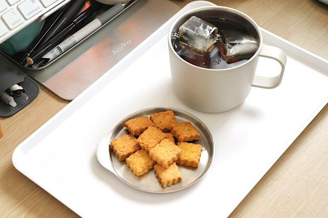 でも、マグカップとおやつをこのトレーにのせれば往復の回数が最小限に。こぼしてデスク周りが汚れる心配もありません。