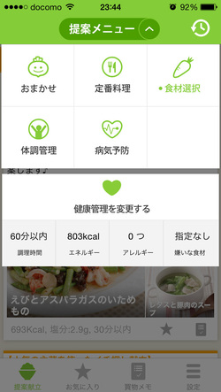 使い始める前に自分の身長や体重を入力します。アレルギー食材や嫌いな食材を入力すれば、その食材を除いたレシピが出てくるそう。おまかせや定番、食材選択のほか、体調管理や病気予防などで献立を検索できます。