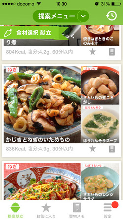 必要な食材やレシピ、買い物リストまで揃って至れり尽くせり。さらに目当ての献立を丸ごとお気に入り登録することも可能です。