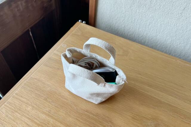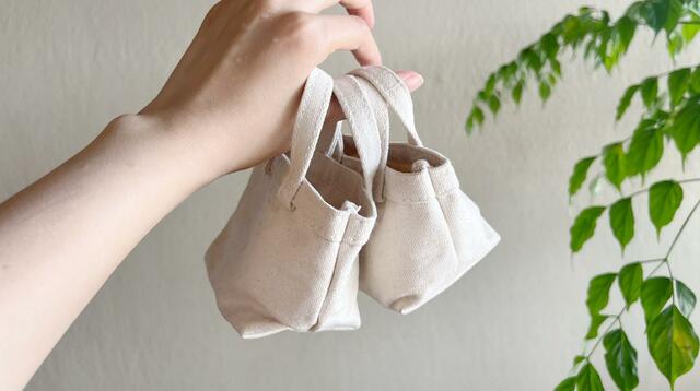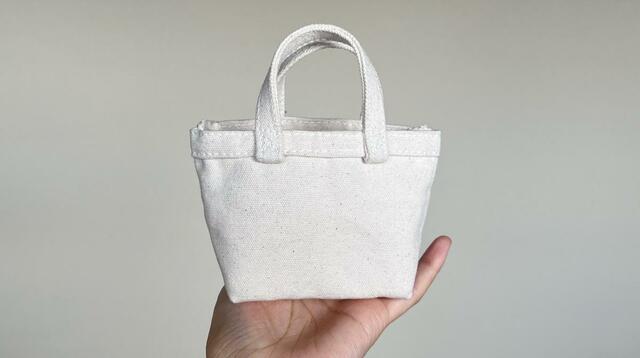 綿100%の厚手の生地でつくられたトートバッグで、サイズは縦8cm・横13.5cm・マチ6cmと手のひらに乗るほどの小さなサイズが特徴的。