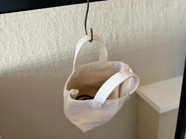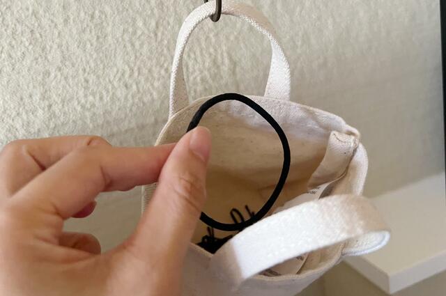 まずひとつ目は、脱衣所近くのフックにかけて、小物入れとして使っています。