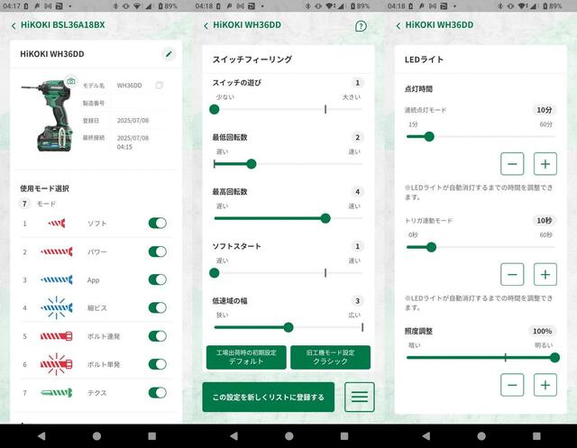 スイッチフィーリング、最低回転数、最高回転数、ソフトスタート、低速域の幅、LEDライトの照度設定など、ユーザーの使用スタイルや作業内容に合わせて細かくコントロールできるので、使い勝手がいいのはもちろん、シンプルにミスを減らせます。