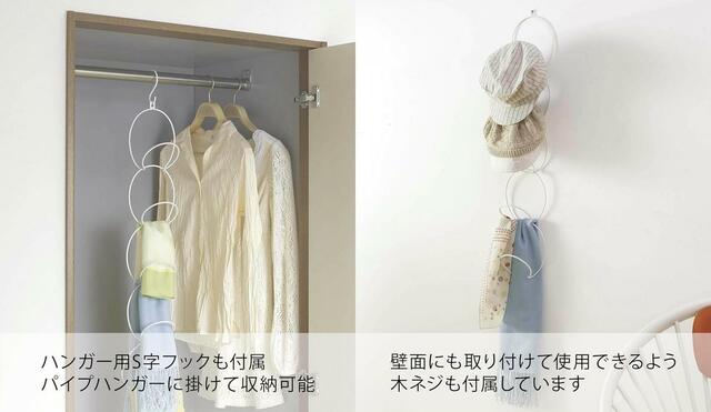 ハンガー用のS字フックや木ネジも付属しているので、どこかにひっかけたり、壁に固定したりして、いろんな場所で使えます。