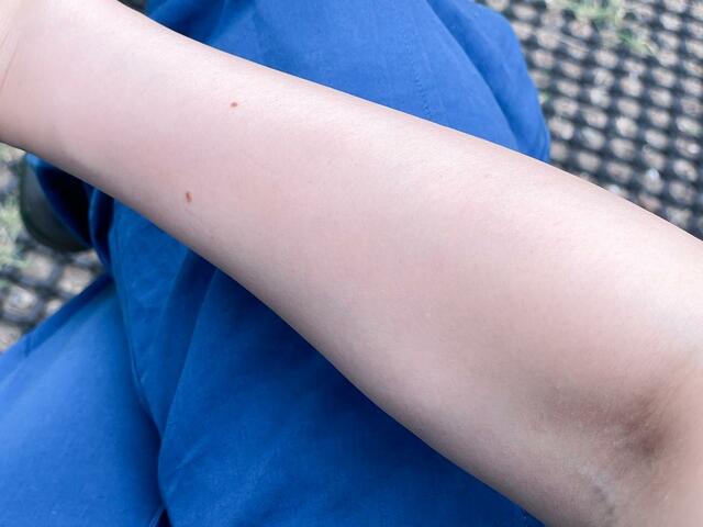 肌のサラサラ感は継続中。みずみずしい日焼け止めを塗ると、肘の内側のシワに白く溜まってしまうのですが、その様子もありません。