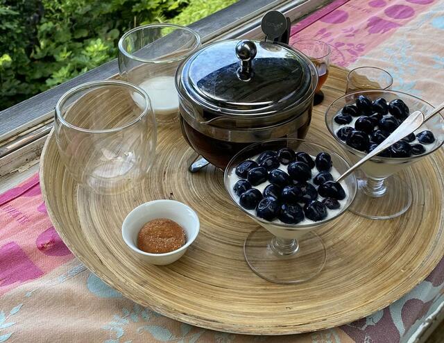 blueberry on yoghurt、petitあんドーナツ、ミルクティ。