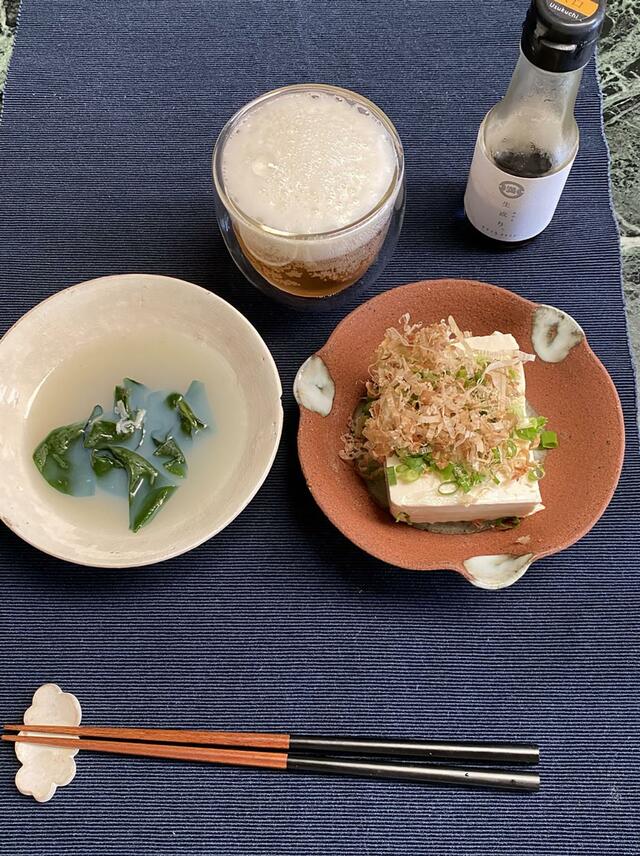 蛤ダシとおかわかめ(いや〜〜しみじみ美味しい)、「つるっと絹」豆腐(豆吉)。