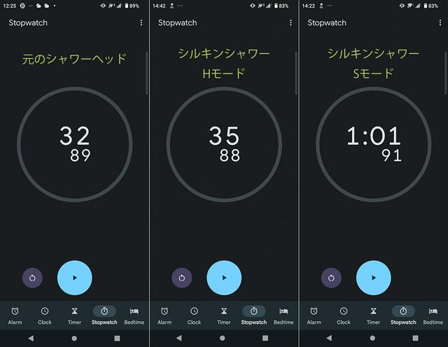 左から、従来品、「シルキンシャワー プレミアムステンレス」のHモード(ハードモード)、Sモード(ソフトモード)です。