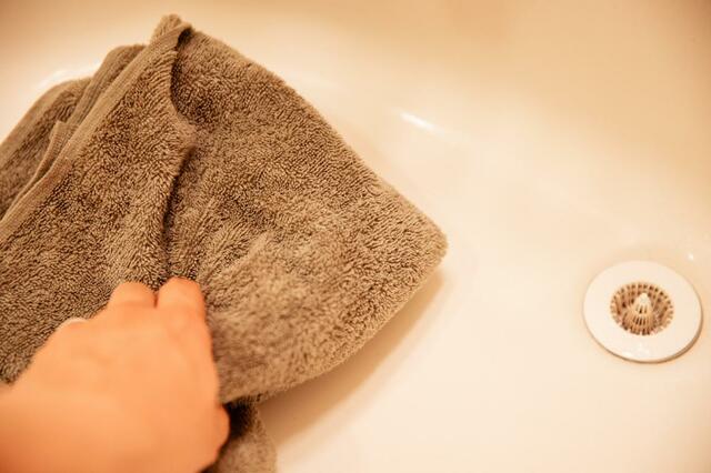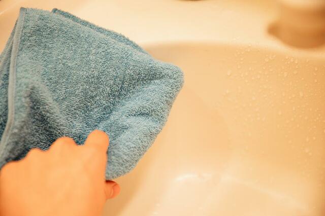 スプレーを塗布する前に、洗面台を洗剤で洗ってから水気を拭いていきます。