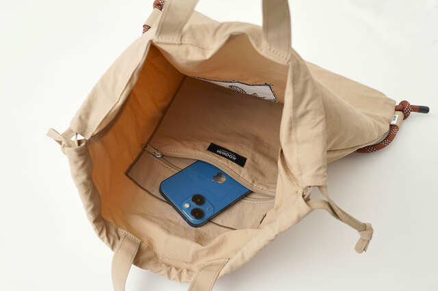 開け口が大きく、財布やポーチ、ボトルなどの必需品をざっくりと収納できるバッグで、内ポケットも完備。サイズはA4サイズが入るサイズ感です。