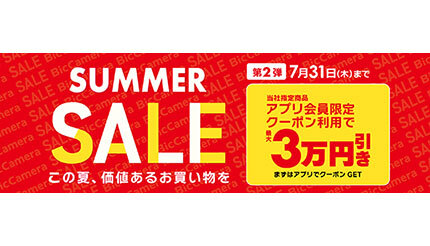 ビックカメラ、アプリ会員限定クーポンの利用で指定商品が最大3万円引きになる「SUMMER SALE」第2弾を開催