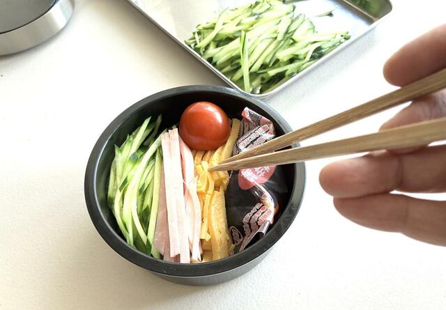 きゅうりやハム、卵焼きを刻んでおかず容器につめれば冷やし中華弁当が完成します。