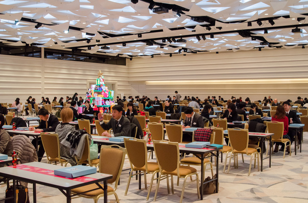 面接会場は大宴会場。いわゆるアルバイト面接でイメージする、個室で1対1という構図ではなく、天井も高い大きな空間でたくさんの面接が同時に行われています。