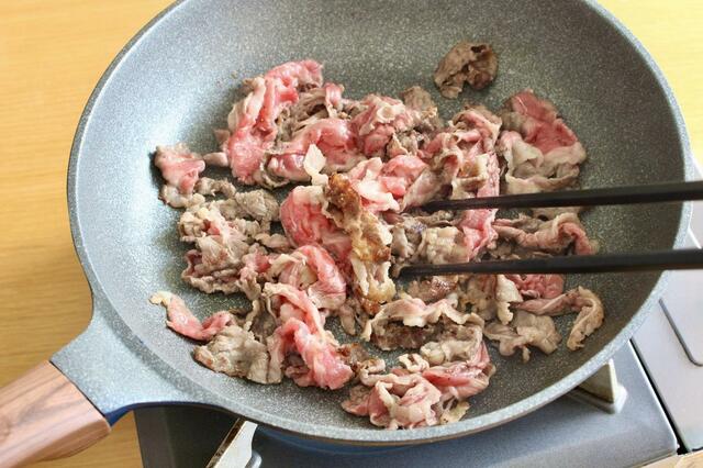 1. 熱したフライパンに軽く油を引いて、牛肉を塩コショウして炒める。