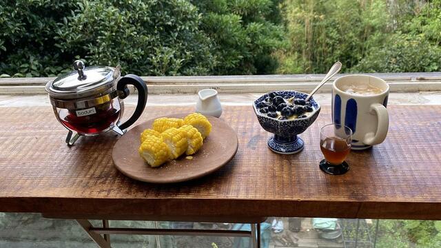 Blueberry on ヨーグルト、iced milk tea、庭育ちのもぎたてトウモロコシ(すぐに加熱したので、さすがに甘美味しい)。