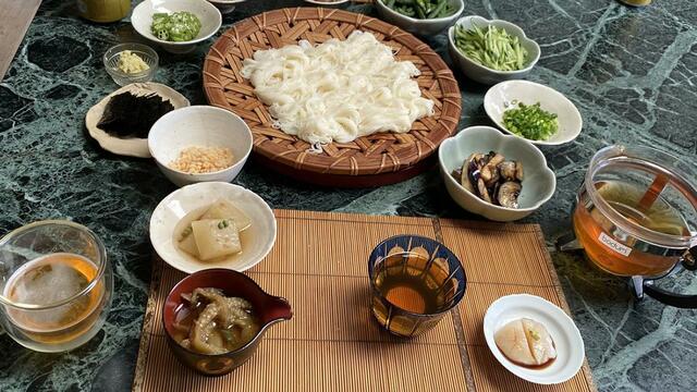 またもや“こぐれ流そうめん”登場です。これは本当にあきません。薬味は、オクラ、すりごま、ミョウガ、インゲン、きゅうり、ネギ、茄子とエリンギ炒め、おろし生姜、焼き海苔、揚げ玉。他に、冬瓜煮と焼きなす、帆立貝柱。