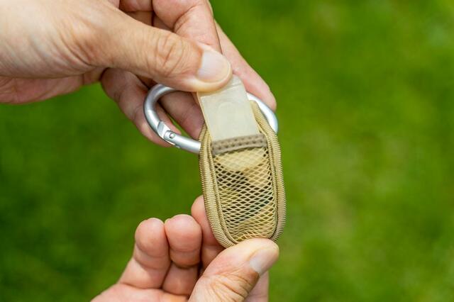 今回紹介するクリップタイプはカラビナが付いているので、パンツのベルトループやバックパックに引っ掛けて提げておけばOK。