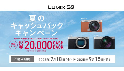 パナソニックは7月18日~9月15日の期間、同社のフルサイズミラーレス一眼カメラ「LUMIX S9」を購入して応募したユーザーを対象にした、「LUMIX S9 夏のキャッシュバックキャンペーン」を開催する。
