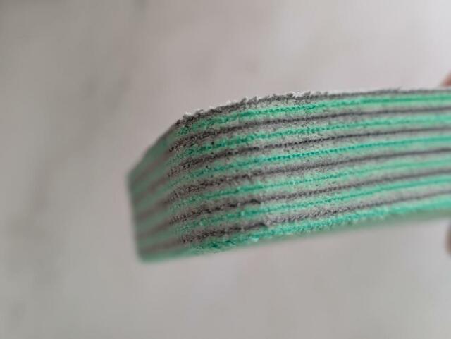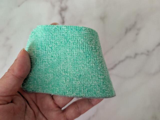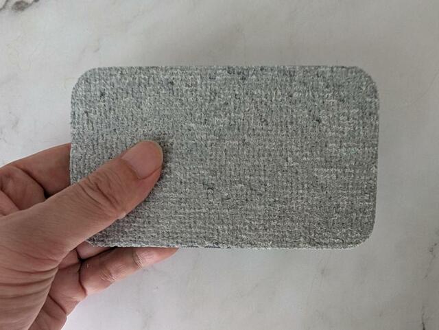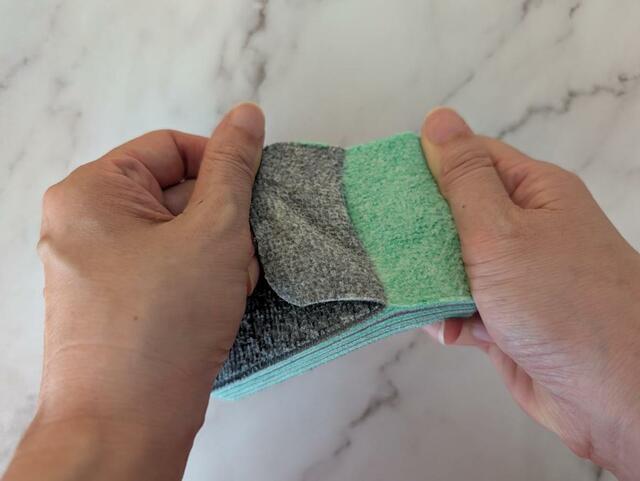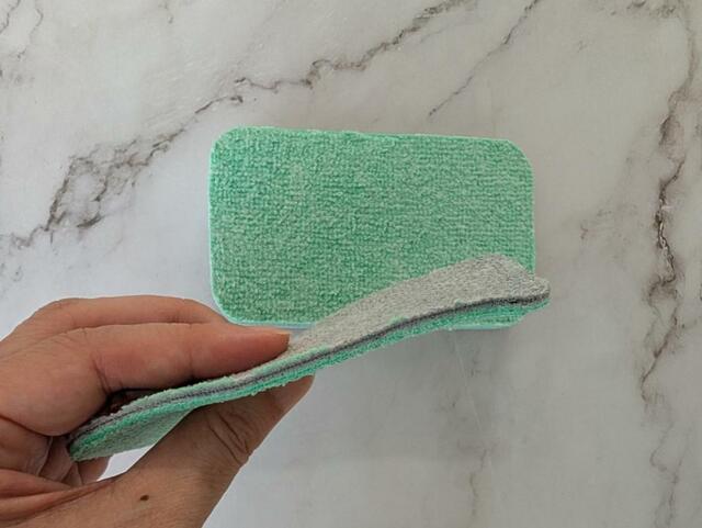 このスポンジは、グリーン部分のマイクロファイバーと、グレー部分のPVA(ポリビニルアルコール)の2種類の素材でできています。