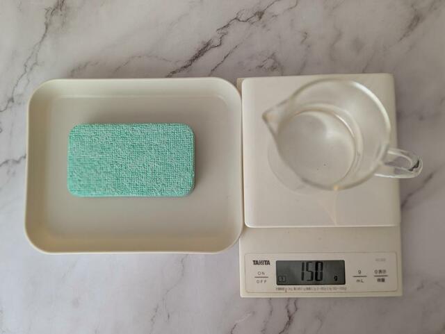 私が選んだ7×12cmのタイプは、約140mlの吸収力があるとのこと。そこで、実際に150mlの水をバットに入れて試してみました。