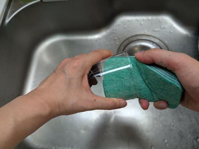 マイクロファイバー側は、軽い汚れの食器や、繊細なグラスを洗うのにぴったり。