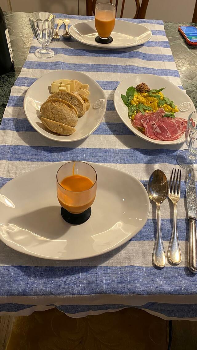 ガスパチョ、生ハム+きゅうり+トウモロコシ、Chantalの粒マスタード(頂き物です。ソーセージとかステーキ等との相性良さそう!)、チーズとパン。