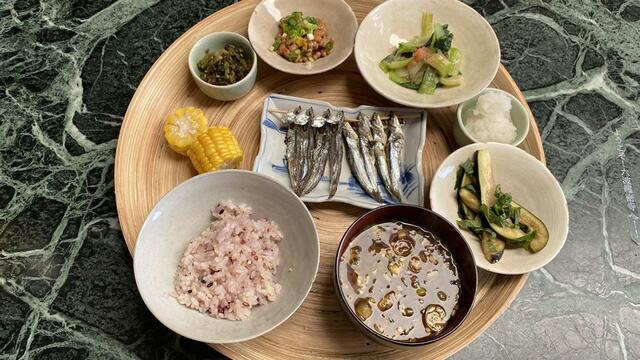 めざし、トウモロコシ、納豆、青梗菜、水ナス、もちきびご飯(通販生活)、味噌汁(オクラ、ミョウガ)、