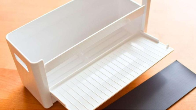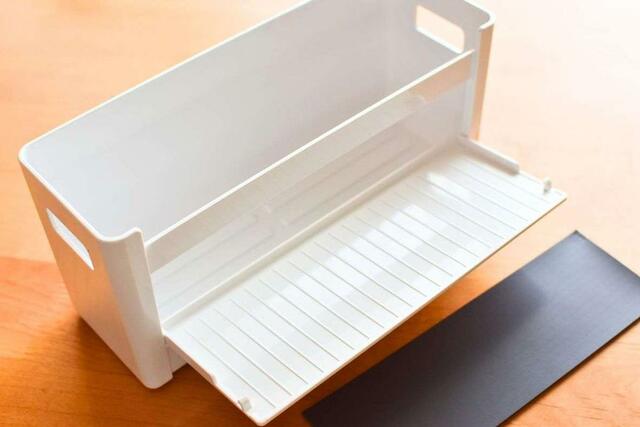 ケースの底はスリット形状で、水切りできる仕様になっています。さらに、横がパカっと開いて、フタやパッキンを置ける開閉式トレーも出現! ここもスリット形状になっていて水切りしやすい点が「分かってるな〜」という感じです。