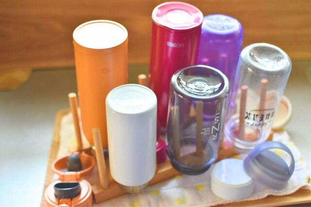 わが家では、洗いカゴとは別に、トレイにふきんを敷いて、こんな感じで食器立てに水筒を刺して干しています。