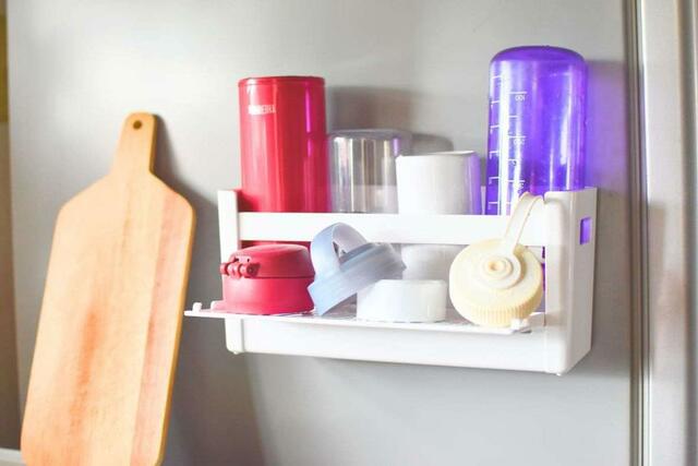 付属の大きめマグネット(写真のグレーのもの)をペタッと貼って、冷蔵庫のサイド面などに貼りつけて使用できるので貴重なシンクのスペースをとりません。