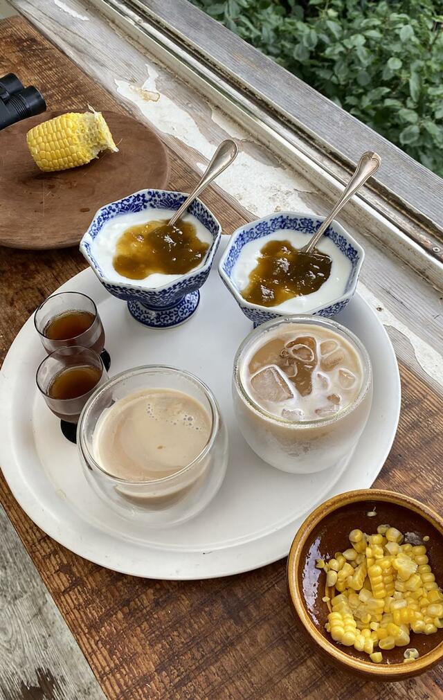 トウモロコシ、梅ジャムヨーグルト、Iced café au lait、本日の元気。