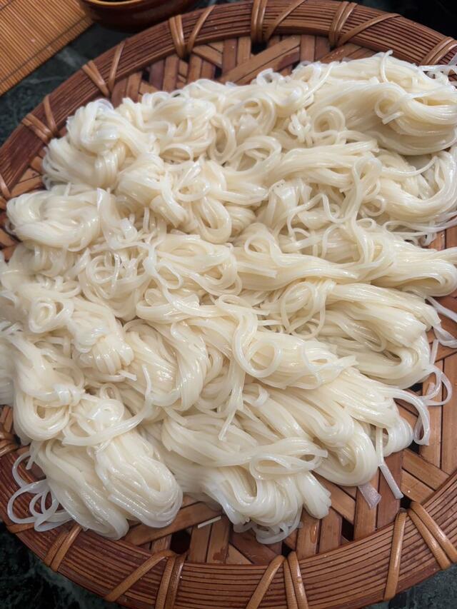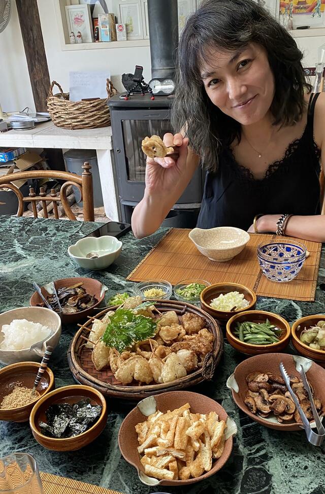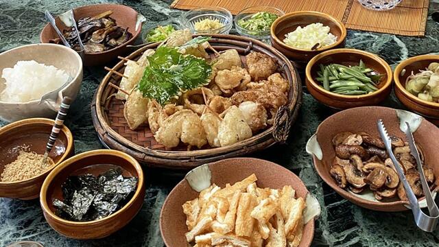 イカと玉葱とシソの天ぷらをぐるりと囲むのは素麺の薬味(ナス炒め、ネギ、おろし生姜、オクラ、インゲン、ミョウガ、マッシュルーム、油揚げ、焼き海苔、すりごま)。