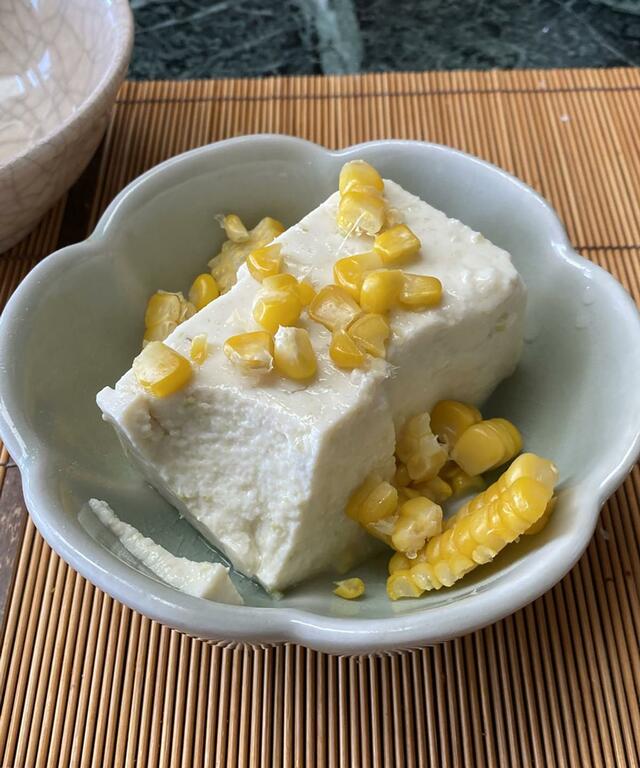 由夏ちゃん来宅。だだちゃ豆腐とトウモロコシ(一緒に食べるとますます美味しい)。