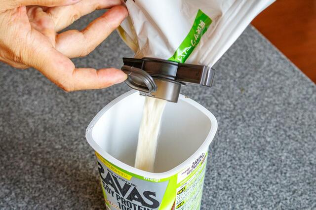 たとえば、毎日飲んでいるプロテインは大きな袋に入っています。シェイカーに入れやすいように小さめの容器に詰め替えているんですが、中身が減ってくると補充が地味に大変。