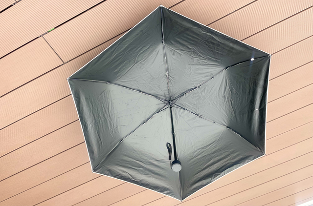 が、これは冒頭で紹介した通り晴雨兼用傘ですが、5層のコーティングが施されているらしく、UVカット99.9%以上(UPF50+)、遮光99.99%以上で、使用時の気になるストレスがまったくない!