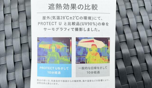 最大の特徴は、「上昇温度 -19.7℃」(※)で、なんでもこの日傘の下にいる場合、なしと場合と比べて温度上昇が約19.7℃低く抑えられるのだとか。