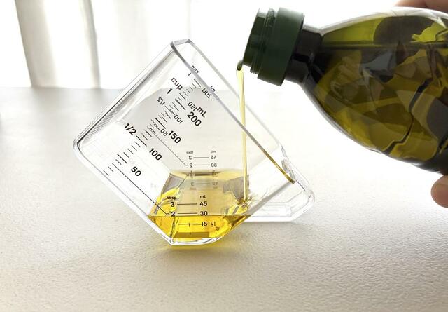 この計量カップなら大さじ3まで斜め置きで量れるので、ボウルなどを汚さずにこの計量カップ1つで完結してくれるんです。