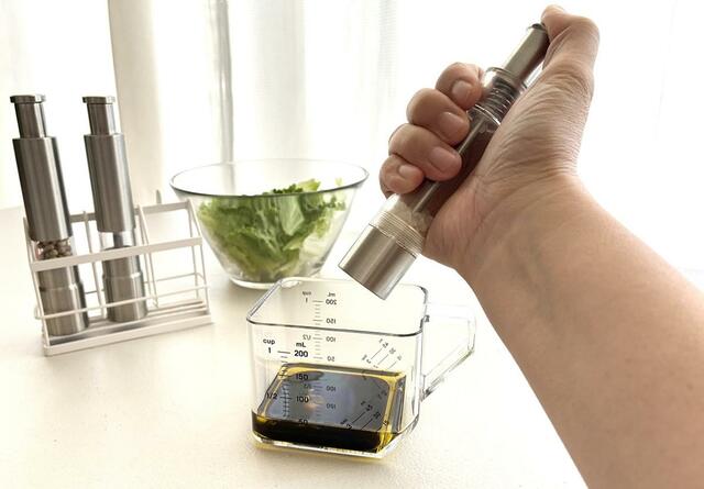たとえば、大さじ2のオリーブオイルに、大さじ1のバルサミコ酢をそのまま継ぎ足しで計量し、塩、こしょうで味を調えたらドレッシングのできあがり……といった具合に。