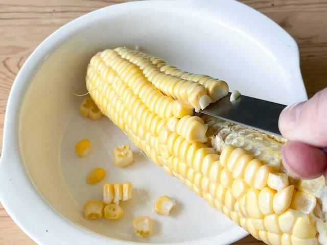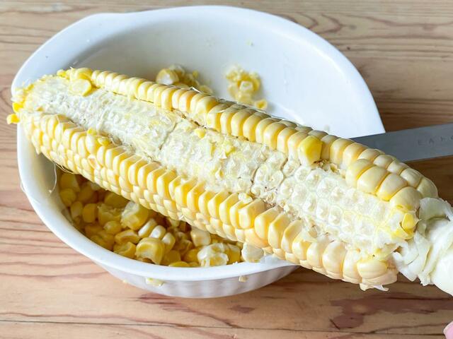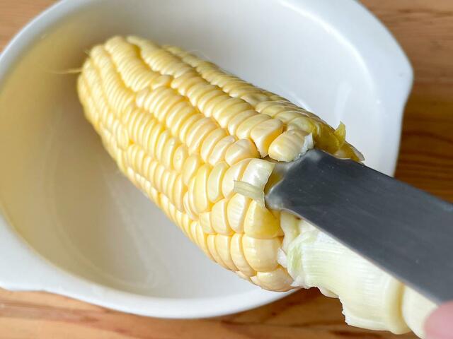 刃を入れる角度が浅いと芯にコーンが残ってしまいますが、もう一度削ぎ落とせば大丈夫。慣れたらもっと上手にできそうです。